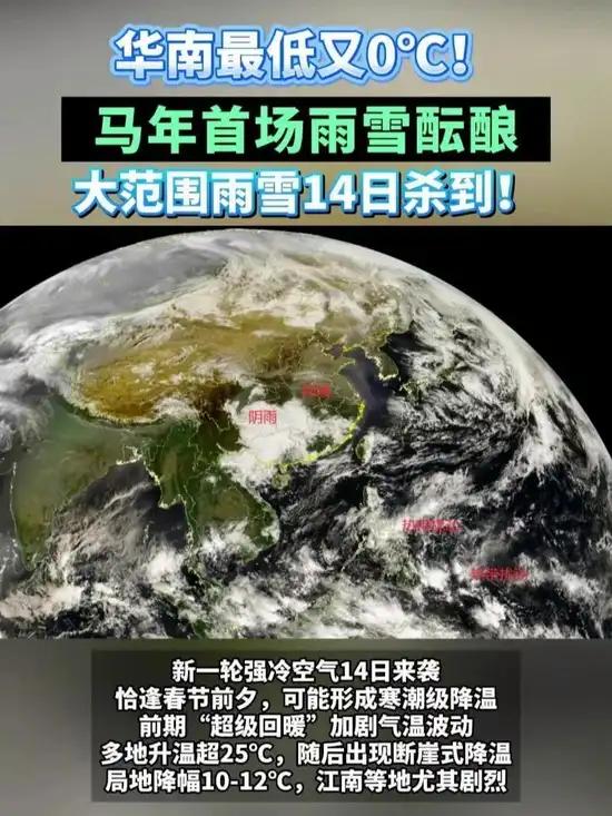 2月14日-16日(腊月廿七至除夕),一股强冷空气横扫中东部,大范围雨雪+断崖式降温同步上线,局地降温高达12℃,陕晋豫鄂四省交界还会下大到暴雪,这事一点没瞎编。