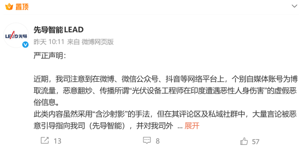 近期,我司注意到在微博、微信公众号、抖音等网络平台上,个别自媒体账号为博取流量,恶意翻炒、传播所谓"光伏设备工程师在印度遭遇恶性人身伤害"的虚假恶俗信息。