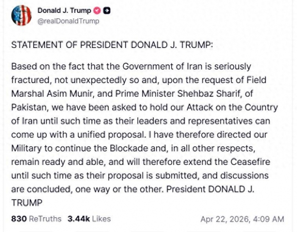 "鉴于伊朗政府内部已严重分裂",美方响应巴基斯坦陆军元帅穆尼尔和总理夏巴兹的请求,"暂缓对伊朗发动进攻,直至其领导人及代表能够拿出一份统一的方案为止。因此,我已指示我方军队继续维持封锁。在其他方面,军队仍须保持高度戒备与战备状态。"
