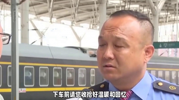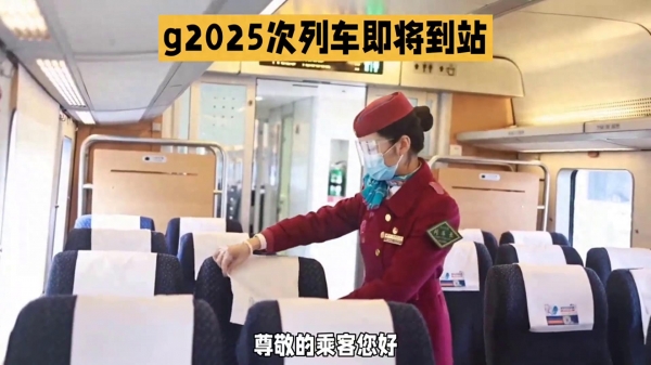 尊敬的乘客您好,您所乘坐的G2025次列车即将到站,请提前做好换乘G2026次新程专列的准备。下车前请您收拾好温暖和回忆,放下遗憾与疲惫,带上勇敢与热爱,多余的烦恼请留在本站寄存。