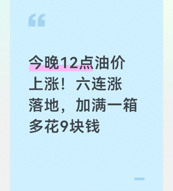 不管是家用车、网约车还是货车,油箱没满的,尽量在今晚10点-12点前去加满,避开晚高峰和最后1小时排队高峰,能省8-10元,相当于一顿简餐钱。