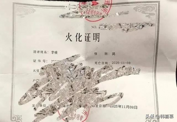 李根的家人曝光了他的火化证明,时间显示是11月8日,称他算是意外去世的。至于他的死因,家属不方便透露,但有其他网友称,李根可能是喝药了,没有救回来,就永远离开了,他的家人都很悲伤。