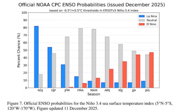 从数据上来说,当下拉尼娜状态维持,其平均数据保持-0.5度左右的区间内,而从长期趋势来看,预计是在2026年1月到3月,转变为中性,或者是厄尔尼诺的趋势呈现,概率为68%。也就是说在后续的转变下就强了。