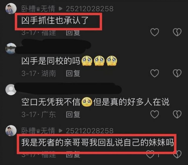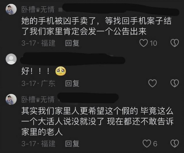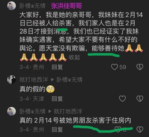 实际上,张洪佳的哥哥曾在今年3月份有过披露,说自己的妹妹在2月14日被人杀害了,家人过了14天才知道这一不幸讯息,而且证实了妹妹遇害。最后的一句话意味深长,他说愿天堂没有欺骗,能够善待她。