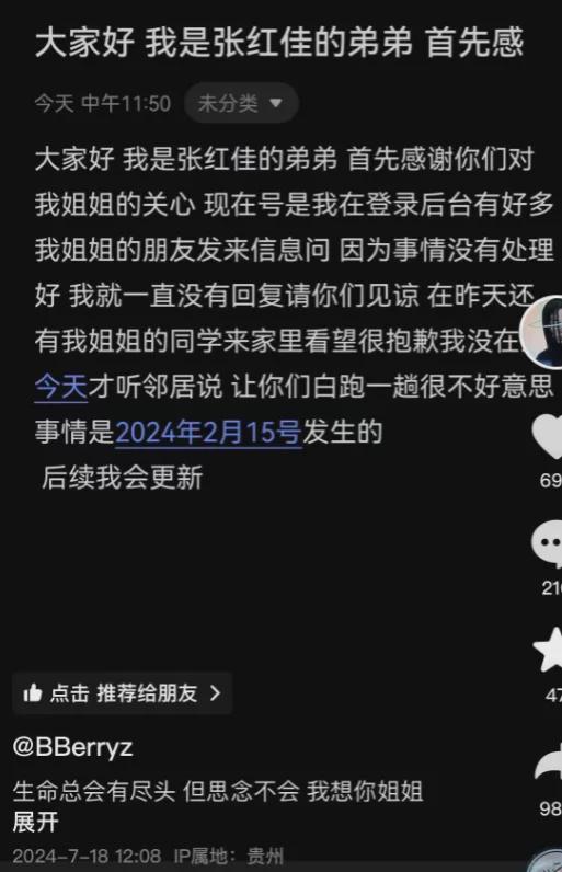 张洪佳遇害在2月14日,而她的弟弟在7月18日,才用姐姐本人的账号发布了动态,很多网友得知消息气愤至极,希望不要放过那个坏人。