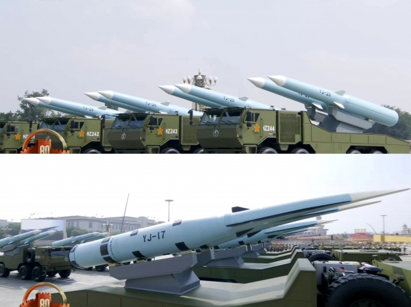 今年阅兵式上中国展示的高超音速导弹有5款,除了陆基版的东风-17外,还有潜艇搭载发射的鹰击-19、水面舰艇搭载发射的鹰击-17和鹰击-20,另外就是空射型的鹰击-21。为什么说今年阅兵式上展示的鹰击-21是空射型的呢?因为这款导弹与此前轰-6K挂载的鹰击-21弹体一模一样,都是采用弹头和弹体不分离设计,外形上与2022年055驱逐舰发射的那枚完全不同,这样的设计其实并不适合舰艇的垂发系统装填发射。