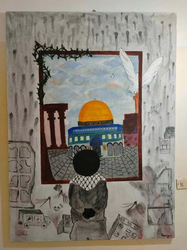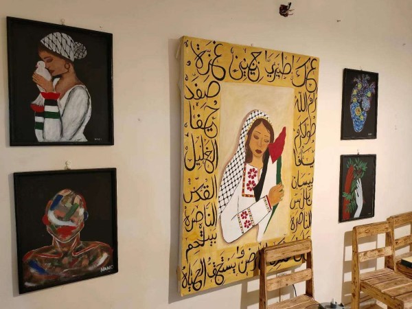 图中的画作是难民营中一位戴头巾的青年女工作人员所画,她也是巴勒斯坦难民的后代,年纪与我相仿,自小在黎巴嫩的山区长大,后来才进城求学,人生轨迹听来甚是坎坷。但她似乎并未受此影响,而是英姿飒爽,谈吐硬朗直率,图中这些办公室里摆放的画作都出自她的笔下,画中光景让人一窥她的巾帼豪情。