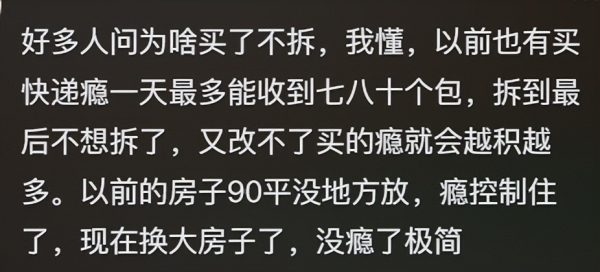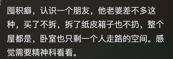 北京安定医院主治医师刘军解释,对于经历过物质匮乏年代的长辈而言,囤积物品往往是"有备无患"思维的体现,物品本身成为他们安全感和财富的象征,而未拆封的快递,则可能是他们对未来可能性的一种期待,或是填补社交空白、缓解孤独感的一种方式。"这种行为有时并非单纯的'节俭',若过度囤积已影响正常生活,甚至引发焦虑、社交退缩等问题,就需要警惕是否存在囤积障碍的可能。"