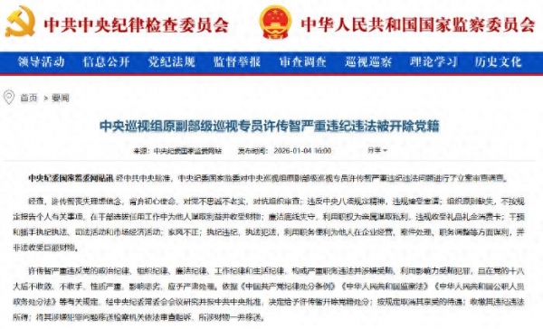 经中共中央批准,中央纪委国家监委对中央巡视组原副部级巡视专员许传智严重违纪违法问题进行了立案审查调查。