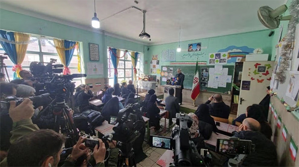 当地时间3月3日,伊朗外交部发言人巴加埃举行每周例行记者会,并选择在德黑兰一所遭袭受损的学校,与国内外记者会面。