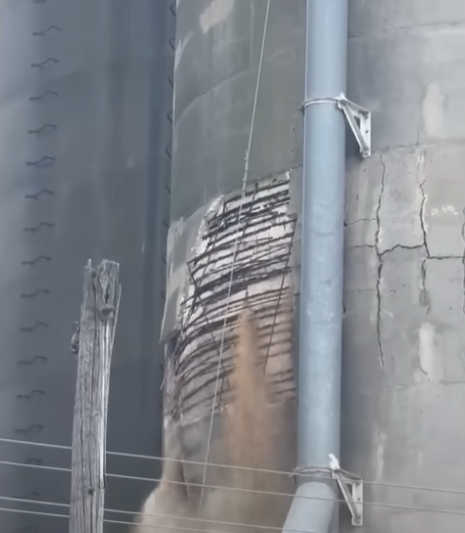谷仓倒塌前已出现结构损坏,水泥破裂,钢筋外露 视频截图