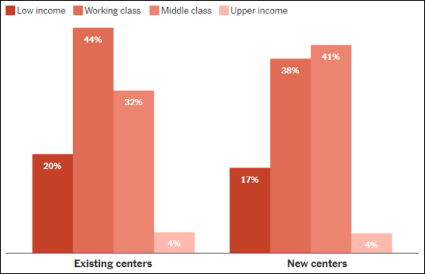 美国的血浆中心选址发生转移,自2021年以来,血浆中心更倾向于在中产阶级社区开设。此图为全美现有(左侧)和新建(右侧)血浆中心在各收入群体中的分布比例。 《纽约时报》制图