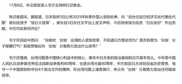 中国外交部11月6日例行记者会上,发言人毛宁质问日本,给鼓吹"台独"论调的人颁发勋章,不知道日方意欲何为?是否有意为"台独"分子撑腰打气?到底想借此向"台独"分裂势力发出什么信号?