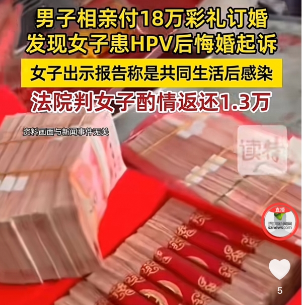 说不清了!一男子订婚,给了女友18.8万彩礼。可一个多月后,女友竟查出患有高危型HPV,男子悔婚,可女友拿出的阴道镜报告单上的时间显示,是两人同居后她才患病的。男子不服说,另一个病历上写的患病时间明明是一年前,那时候他俩还不认识。可女友却说,另一个病历上的患病时间是医院误写的,以阴道镜报告单上的时间为准。可男子坚持女友婚前不检点,要求分手,退彩礼。最终,女友将男子告了,最终法院这样判了!