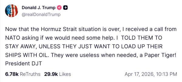 美国总统特朗普4月17日在社交媒体平台发文说:"霍尔木兹海峡的问题已经解决了,我(这才)接到北约来电,询问我是否需要援助。"