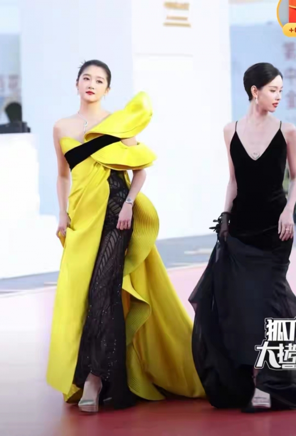 要说这次最大的惊喜,必须是关晓彤。老天爷终于开眼了,她终于穿对了一次!一身饱和度极高的亮黄色礼服,明晃晃得像个小太阳,这种颜色谁穿谁翻车,简直是时尚界的"死亡考题"。可关晓彤硬是把它穿出了神女下凡的感觉,清新脱俗,气场全开。她好像天生就适合这种玫红、亮黄的大色块,别人穿是土气,她穿是贵气。黑色的底裙从领口垂到地面,视觉上无限拉长身高,整个人高挑又婀娜。黄色的硬挺扇面设计层层叠叠,不仅没显壮,反而增添了几分古典韵味。她自己也知道这次赢了,走红毯时那股自信带劲的劲儿,藏都藏不住。旁边的陈都灵虽然也美得优雅,一身赫本风黑丝绒礼服,但在这抹亮黄色旁边,还是被抢走了不少风头。