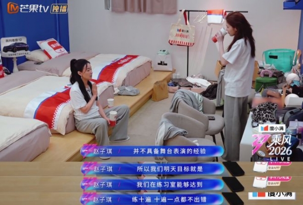 赵子琪开始立下第二天的目标,她说因为她们不具备舞台表演经验,所以第二天目标是练习室能达到10遍不出错。