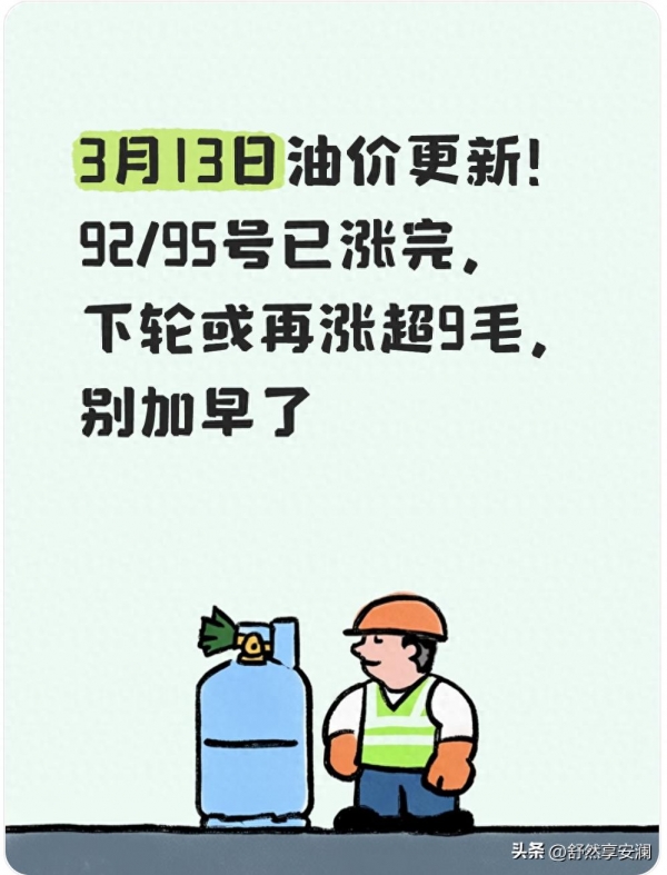 1. 3月13日油价已更新,92/95号均完成调价,下轮3月23日24时大概率大涨超9毛/升。