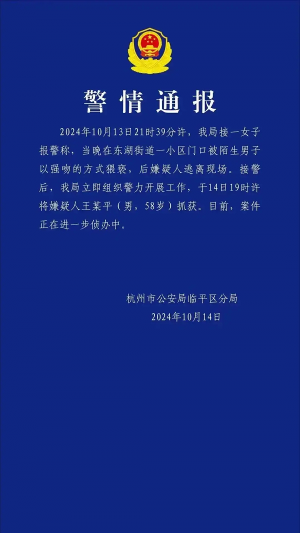 10月14日,杭州市公安局临平区分局发布警情通报:已将嫌疑人王某平(男,58岁)抓获。