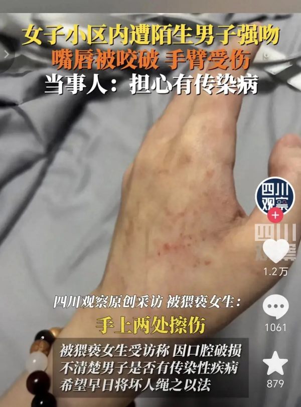 该女子说当时她正在自家小区发消息,突然闯过来一陌生男子强吻,没有任何征兆,我抓住她之后被她反击,之后就跑了,手臂和胳膊都受了伤。