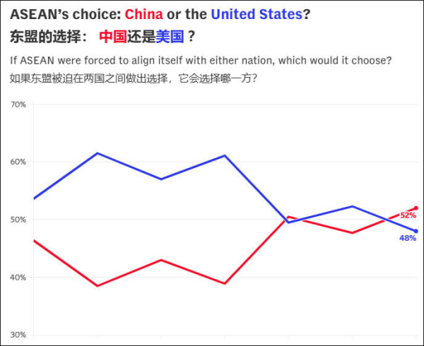 这份《2026年东南亚态势报告》提出"被迫在中美这对战略竞争对手间二选一"的假设性问题,结果显示52%的受访者选择中国,48%选择美国。这一问题在2020年首次出现在调查中。