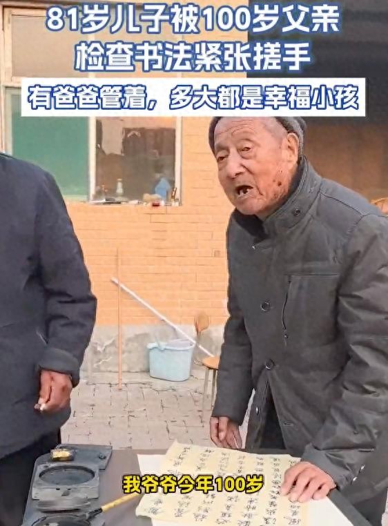 事情是这样的,3月11号,在保定一户人家里,一位100岁的老父亲,正拿着81岁儿子的书法作品,认认真真地"检查作业"。老爷子戴着帽子,端坐在那里,盯着纸上的字,十几秒钟没说话。可把旁边81岁的儿子给紧张坏了,站在一旁手足无措,手不停地搓来搓去,那表情,就跟咱们小时候被老师点名、被爸妈查作业时一模一样。