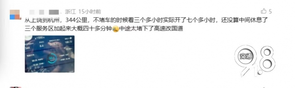 "一开始导航让我走常规路线,从龙游上溧宁高速,再转杭新景。但我出发时发现,老家江山那个口子开了,我就先上了溧宁。"郑先生表示,"起初一路还算顺畅,只在转沪昆高速时堵了一小段。"