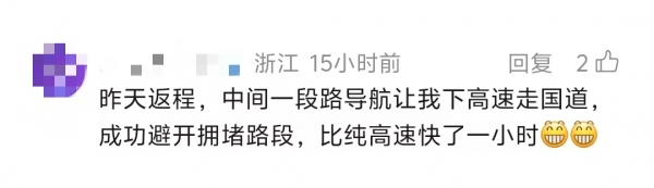 然而,在返程途中,杭州的郑先生不仅成功避开了让人抓狂的拥堵,还在路上悠闲地买了筐草莓,"比起全程按照导航走高速,足足快到了近一个小时到家!"郑先生说。