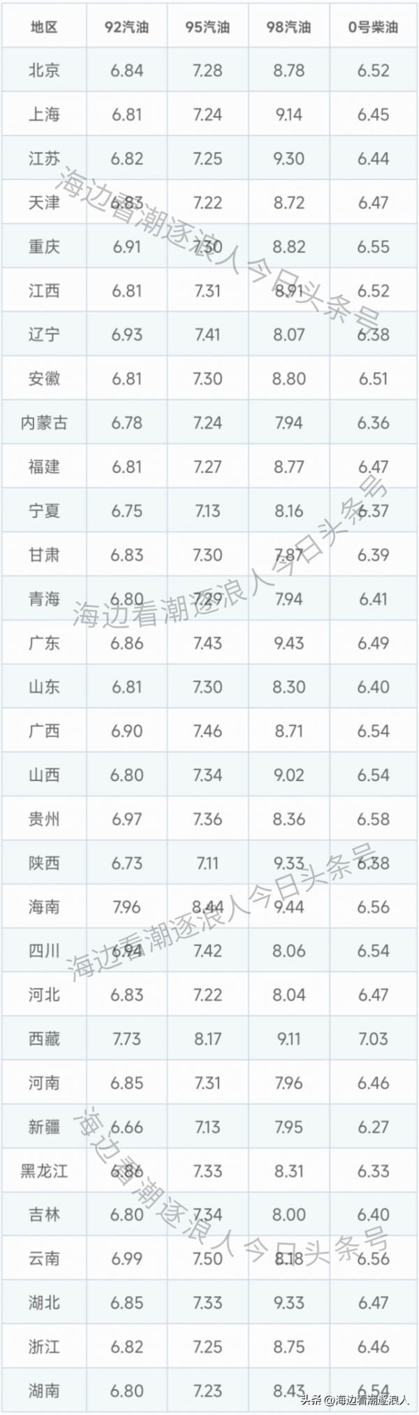 对于云南、陕西、西藏、四川、内蒙古、贵州、青海、黑龙江、新疆等省份的油价没有实行统一价格,这边列出的是省会城市的最高零售价格。