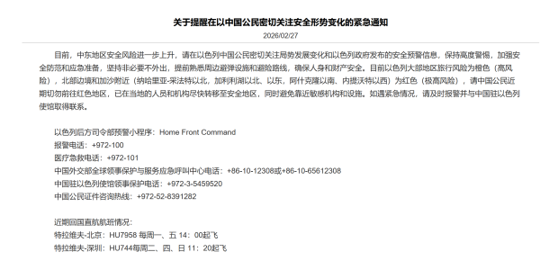 27日,中国驻以色列使馆网站发布《关于提醒在以中国公民密切关注安全形势变化的紧急通知》: