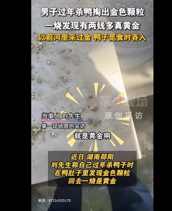 刘先生告诉第一现场记者,之前河里就开采过金子,然后鸭子在河里散养着,会吃泥巴,金子就被吃进肚子里了。"我问过家里老人家,他们说这个事情见怪不怪了。在鸭肚子里发现金子并不是第一次,其它人也遇到过类似的情况,只是没有我发现的多。"