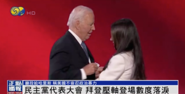 在女儿阿什利的介绍下,拜登走上舞台,全场起立鼓掌。在与女儿拥抱时,拜登不禁动容拭泪。