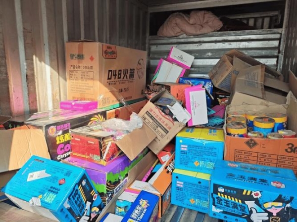 案例8:2025年12月29日,福绵区应急、公安部门联合开展打击非法生产、经营、储存烟花爆竹工作,在石和镇一仓库中发现一处非法储存烟花爆竹制品窝点,现场依法查扣各类非法烟花爆竹产品162件(箱)。