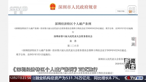 为了破解个人债务难以化解的困境,2021年3月1日,全国首部个人破产地方性法规《深圳经济特区个人破产条例》正式施行,在深圳经济特区居住,且连续参加深圳社会保险满三年的自然人,若因生产经营、生活消费等原因导致丧失清偿债务能力,或者资产不足以清偿全部债务,可启动破产清算、重整或者和解等不同的破产程序。