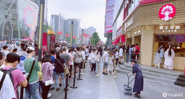 2021年,霸王茶姬成都春熙路店的排队盛况