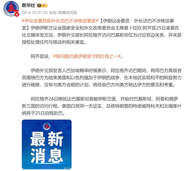 美国方面,白宫新闻秘书莱维特24日接受媒体采访时证实,威特科夫和库什纳将就与伊朗谈判事宜于25日上午前往巴基斯坦。与此同时,包括副总统万斯在内,美方谈判代表所有成员随时待命,如有必要将飞往巴基斯坦。她还说,过去两天,美方从伊朗方面看到"一些进展",希望本周末的会谈取得更多进展。