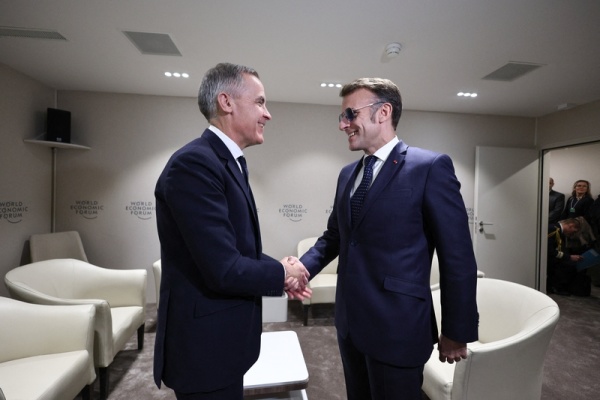 达沃斯世界经济论坛年会期间,加拿大总理卡尼与法国总统马克龙举行双边会晤。