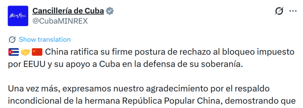 古巴外交部表示,中方重申反对美国对古封锁的坚定立场,并支持古巴维护国家主权。"这表明古巴并不孤单。"