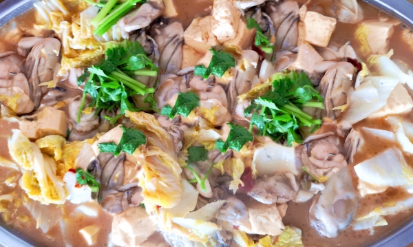 准备食材:白菜、豆腐、海蛎子、五花肉、葱、姜、干红辣椒、生抽、盐、香油、香菜、食用油。