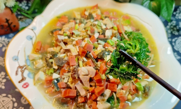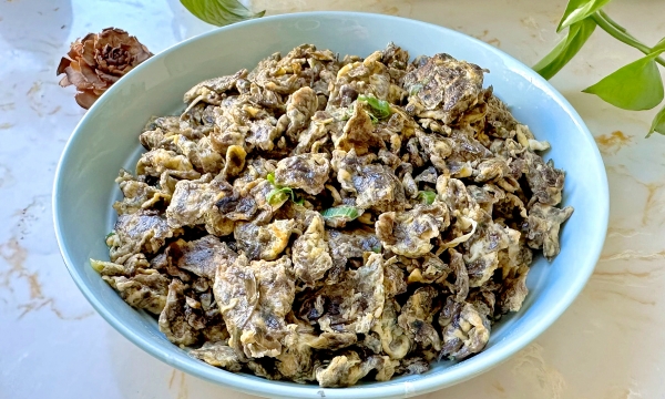 做法:用温水将紫菜浸泡十几分钟后,清洗两遍,挤净水分,稍微切几刀,装入盆中备用。加入4个鸡蛋,一勺盐,适量葱花,将蛋液搅散,使紫菜和蛋液充分融合。热锅加油,油热后,倒入紫菜蛋液,中火炒,炒至蛋液定型后,加入适量生抽,蛋液全部熟透后,盛出装盘即可。
