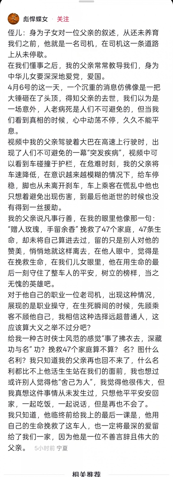 其子小周在社交平台发文《身为子女对一位父亲的叙述》,他写道:还未养育我们之前,他就是一名司机,在司机这一条道路上从未停歇。对于他这样一位职业司机,出现这种情况,在生死瞬间的时候,展现的先顾乘客不顾自己的职业操守,是大义之举,给儿女树立了当之无愧的英雄形象。