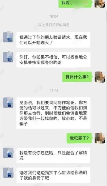 "他说反正到时候来了就知道了。"小王回忆,尽管在电话和微信聊天中,自己多次询问该民警警号和核实具体事宜,但该民警始终不透露任何信息,只是要求其去一趟四川简阳,或者其来深圳,小王顿时想起海底捞于四川简阳起家,她不禁产生联想,拒绝前往简阳,双方未再联系过。