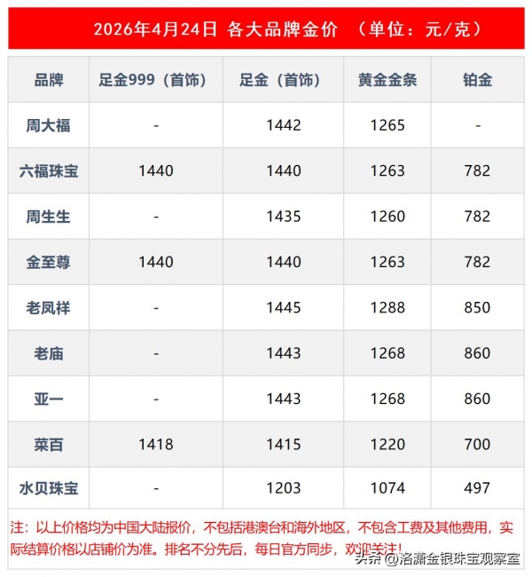 二、2026年4月24日10:00各大品牌 黄金、铂金和金条价格