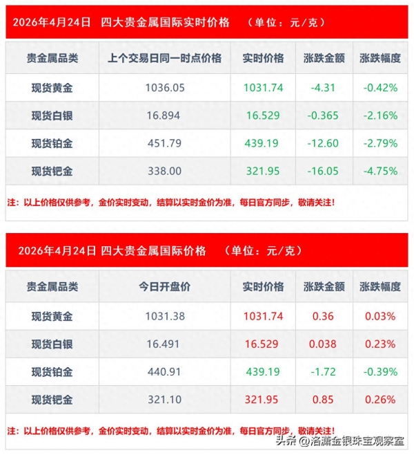 2026年4月24日,国际贵金属市场整体表现疲软,四大贵金属价格普遍下跌,其中钯金跌幅最为明显,现货钯金较上个交易日同一时点下跌4.75%,报321.95元/克。铂金紧随其后,下跌2.79%至439.19元/克。现货白银下跌2.16%,报16.529元/克。现货黄金相对抗跌,仅小幅回落0.42%,报1031.74元/克。