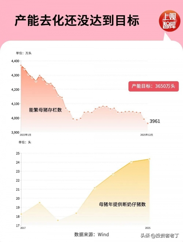 而供给端该出栏的猪一头都没少,全国能繁母猪存栏在2026年1月还有3958万头,离农业农村部新下调的3650万头目标差了300多万头。