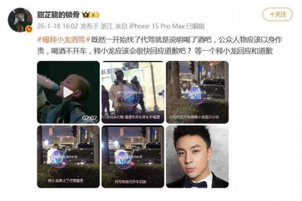 曝释小龙疑似酒驾,聚餐后叫了代驾,却在临近小区时自行驾车