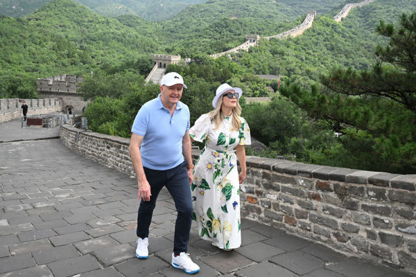 2025年7月16日,澳大利亚总理阿尔巴尼斯(左)与伴侣朱迪·海登参观长城。IC Photo