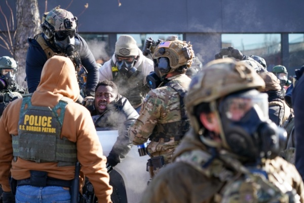 1月24日,美国明尼苏达州明尼阿波利斯市,美国执法人员将一名受伤的抗议者抬上皮卡车。 IC Photo