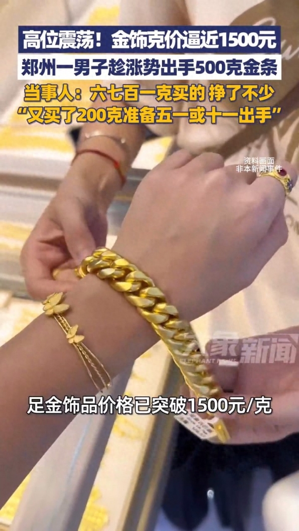 最近两天,金店的足金饰品价格已经突破了1500元每克,达到了惊人的1504元每克。