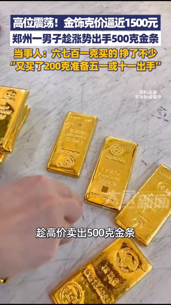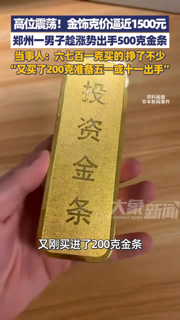 郑州一位男子,一直热衷于投资黄金。当时金价涨到每克600多元的时候,他判定金价一直还会继续上涨,于是果断拿出30多万,购买了500克金条。
